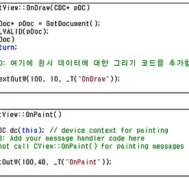 [MFC] OnDraw vs OnPaint 차이점. ● OnDraw함수와 OnPaint함수의 차이점 인터넷을 찾아보면 주로 그 차이점을 이렇게 표현하고 있습니다.OnPaint는 화면출력을 위한 함수이고 OnDraw는 화면출력뿐 아니라 프린터 출력에도 관여되는 함수이다 .라는 내용입니다. 이내용이 틀린 것은 아닙니다. 하지만 뭔가 궁금해서공부를 하고 싶은 수강생들에게는 그외에도 알고 싶은 것이 있을 것입니다. 수강생들이 원하는 것은 같은 화면에 출력하는 함수가 2개가 존재한다면 OnPanit의 코드도 수행하고 OnDraw의 코드도 수행되는가 하는 것입니다. 아니면 어떤 것은 되고 어떤 것은 수행이 되지 않는가 또는 어떤 것을 더우선적으로 수행해 주는가 하는 것이 궁금한 것입니다. 우선 OnDraw함수에도 코드를 넣고 OnPaint함수도 메시지함수를 만들어서.. 더보기 이전 1 ··· 39 40 41 42 43 44 45 ··· 49 다음